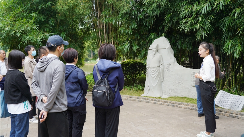 參觀的第二站是竹園,一走進竹園,“竹未出土先有節(jié)”這句漢白玉雕刻的詩詞在郁郁蔥蔥的竹林掩映下十分醒目。園區(qū)分為“頌竹”“品竹”“聽竹”“知竹”,完美地將“景”與風清氣正的“廉”融合,構成“半山半水半竹林”的雅致景色。在參觀過程中,講解員向大家訴說著古代清官廉吏的典故,感受著先輩們剛正廉明的優(yōu)秀品質,也體會到古往今來的“廉竹精神”。