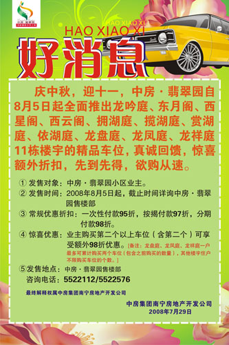 慶中秋,迎十一,中房·翡翠園自85日起全面推出龍吟庭、東月閣、西星閣、西云閣、擁湖庭、攬湖庭、賞湖庭、依湖庭、龍盤(pán)庭、龍鳳庭、龍祥庭11棟樓宇的精品車(chē)位,真誠(chéng)回饋,驚喜額外折扣,先到先得,欲購(gòu)從速。